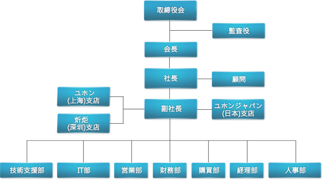 2007年10月:ユホン(上海)貿易有限公司(上海浦東)を設立 2014年9月:炘炬科技 ( 深圳 ) 有限公司( 深圳宝安) を設立 |